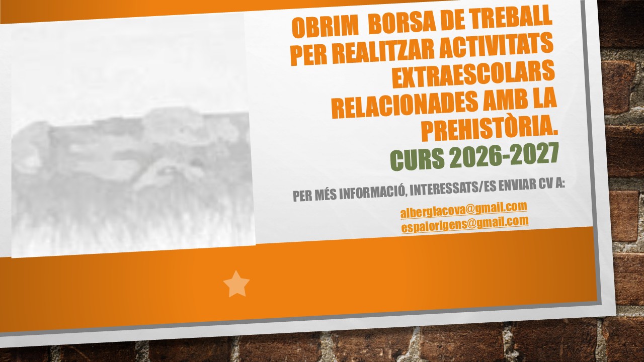 Obrim la borsa de monitors/es d'activitats extraescolars per al curs 2026-2027. Si t'agrada el món del lleure i la prehistòria, no ho dubtis envia'ns el teu CV a alberglacova@gmail.com i et contactarem per explicar-te tots els detalls de la borsa.